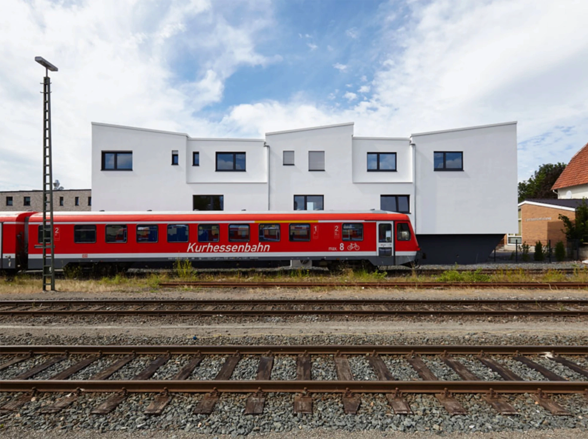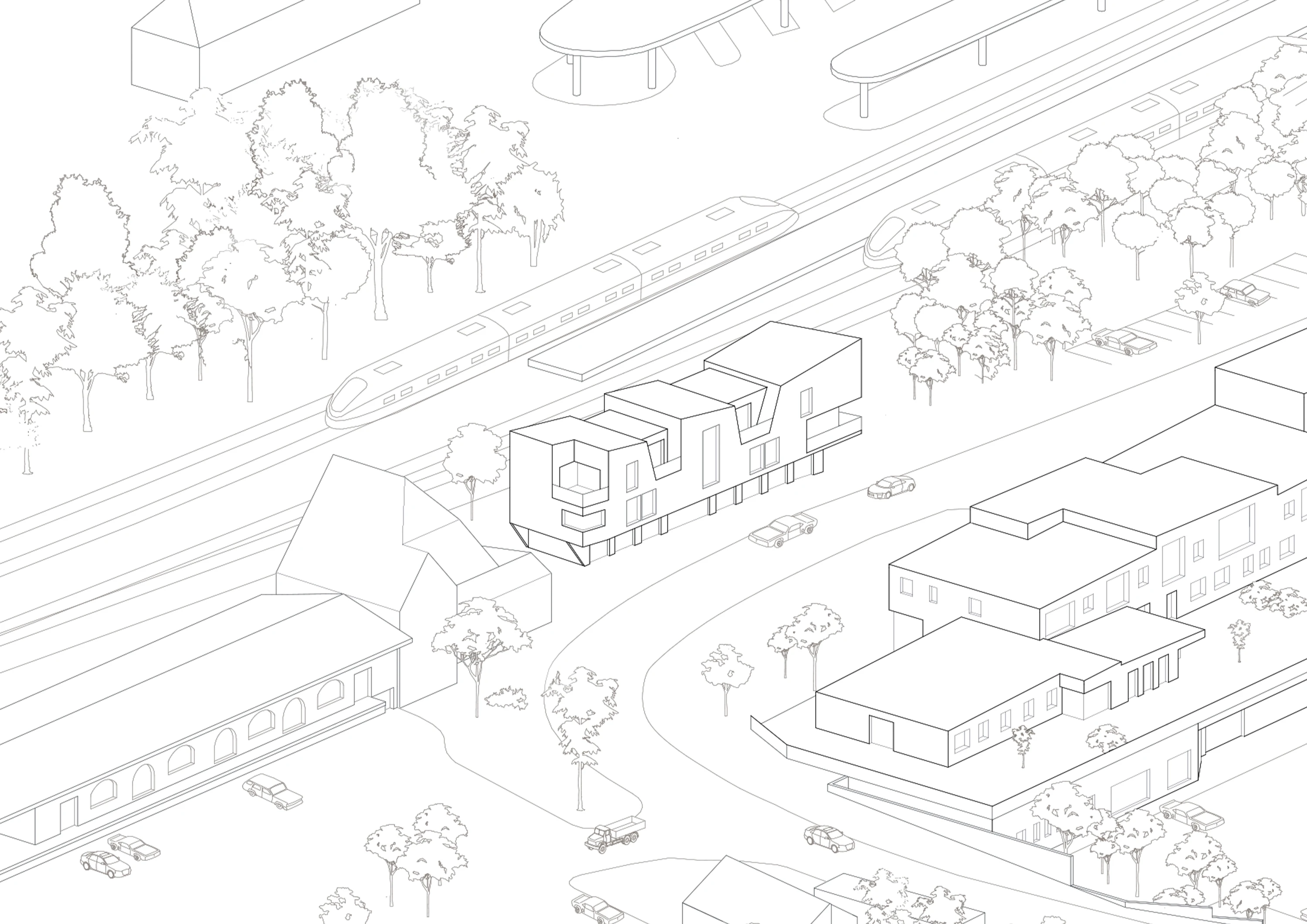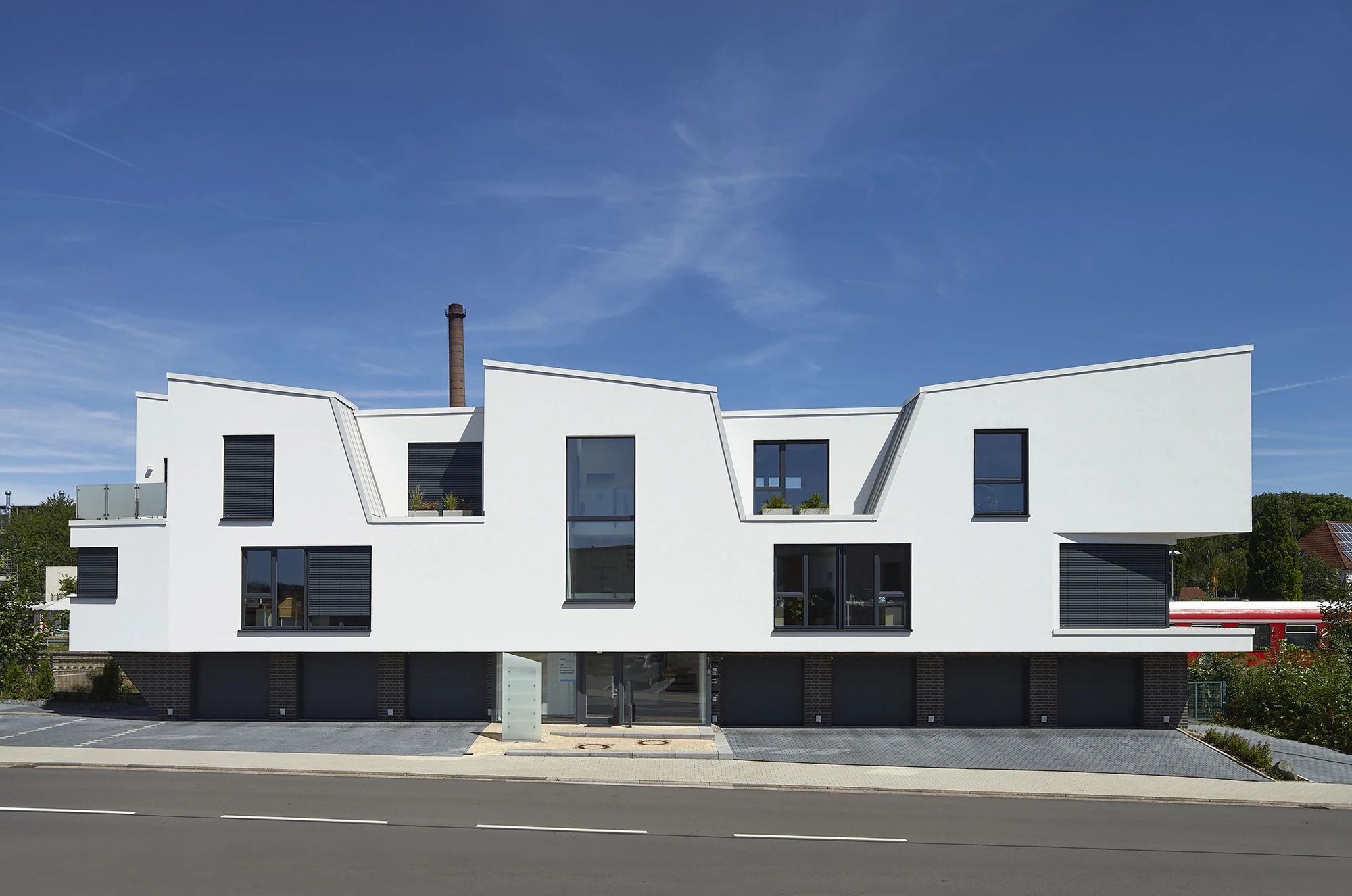 Since 2013, the socially and functionally diverse Hanse Platz Quarter in Korbach has been under development through close collaboration between the citizens of Korbach, the city administration, and the mayor. Located near Korbach’s main train station, this new neighborhood stands as a testament to cooperative urban planning. A key feature of the quarter is the building Between Tracks and Road, positioned on a narrow plot between the train tracks and Am Hauptbahnhof street. Originally planned to house just seven garages, the design was expanded after successfully convincing the client to add two additional floors, transforming the structure into an urban element. The building’s upper part cantilevers outward on all sides, increasing the usable floor area. Therefore, it accommodates not only garages but also educational spaces, a psychiatric practice, and workspaces. Its distinctive shape and multifunctional design have made it a dynamic and integral part of the neighborhood, contributing to its evolving and vibrant character.